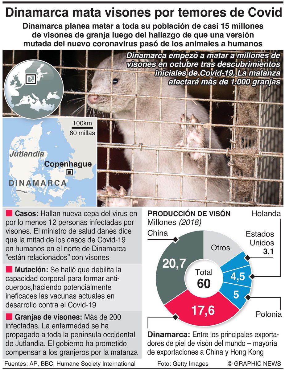 Según las autoridades danesas al parecer esta mutación que ha permitido la infección en los animales no agravaría las complicaciones causadas por el coronavirus en el ser humano pero sí se. Como ya ocurrió en otros países las autoridades de Dinamarca han encargado estudios para determinar cómo se produjo la infección del coronavirus de la Covid-19 en las granjas. El Ejército la Policía y las Guardias locales serán desplegadas para acelerar el proceso de sacrificio de hasta 17 millones de estos animales la totalidad de visones en Dinamarca.